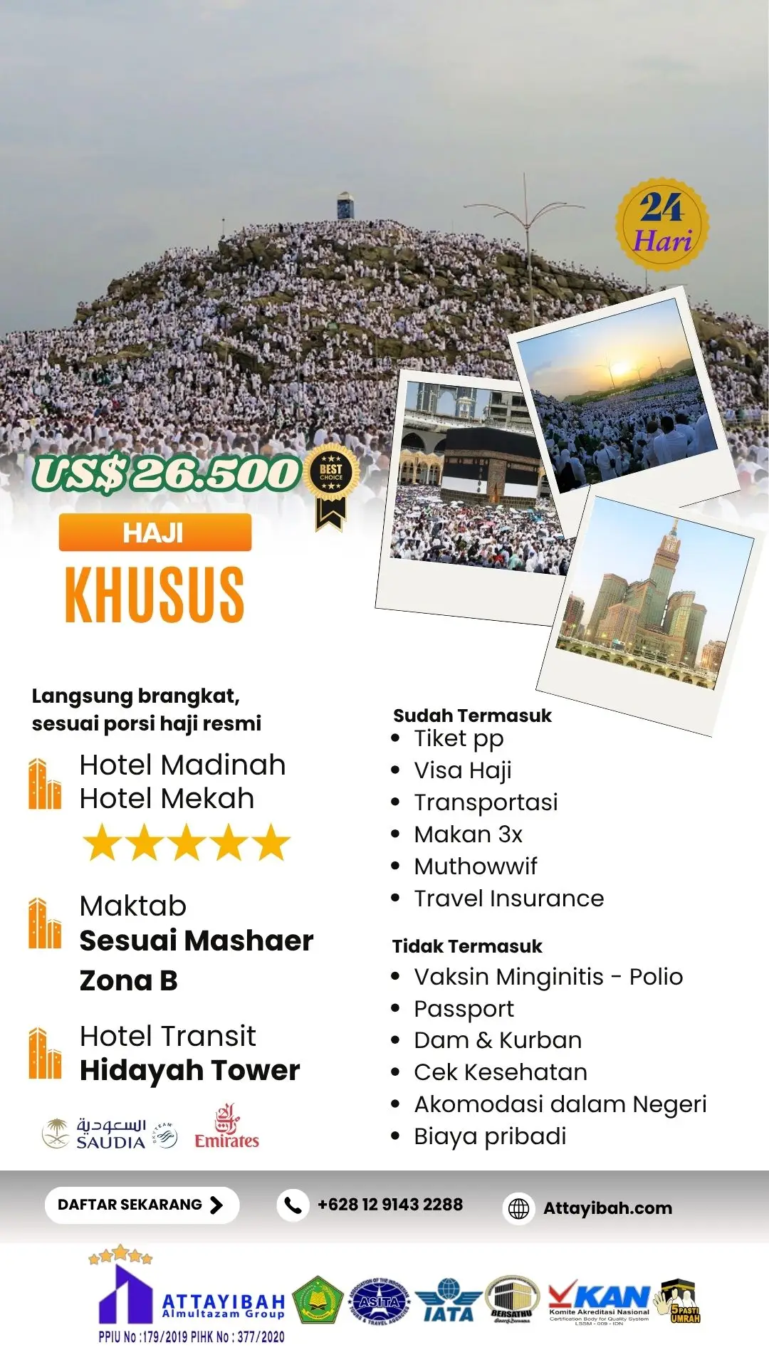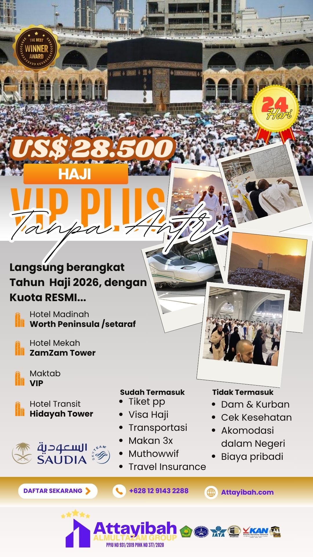 Siap menunaikan Haji? Hubungi Attayibah Sekarang untuk informasi detail paket Haji dan Kuota terbatas. Jangan lewatkan kesempatan emas ini!